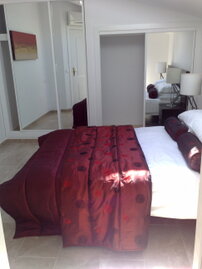 Voorste slaapkamer heeft openslaande deuren naar terras, waar ook een droogrek aanwezig is.